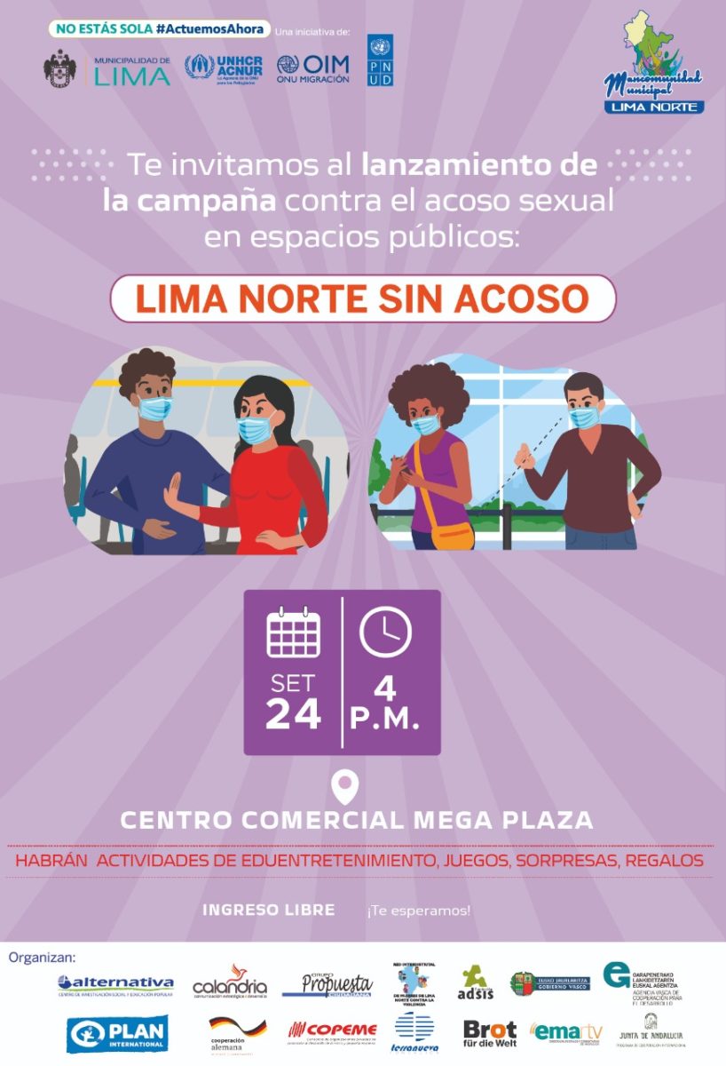 La Mancomunidad de Lima Norte, junto a otras organizaciones, impulsan la campaña “Lima Norte sin acoso” con el objetivo de prevenir el acoso sexual en espacios públicos. Acompáñanos al evento de lanzamiento. Y recuerda, si eres testigo de una situación de acoso sexual, llama gratis a la línea #100 o llamando al 948985901 #NoEstasSolaActuemosAhora