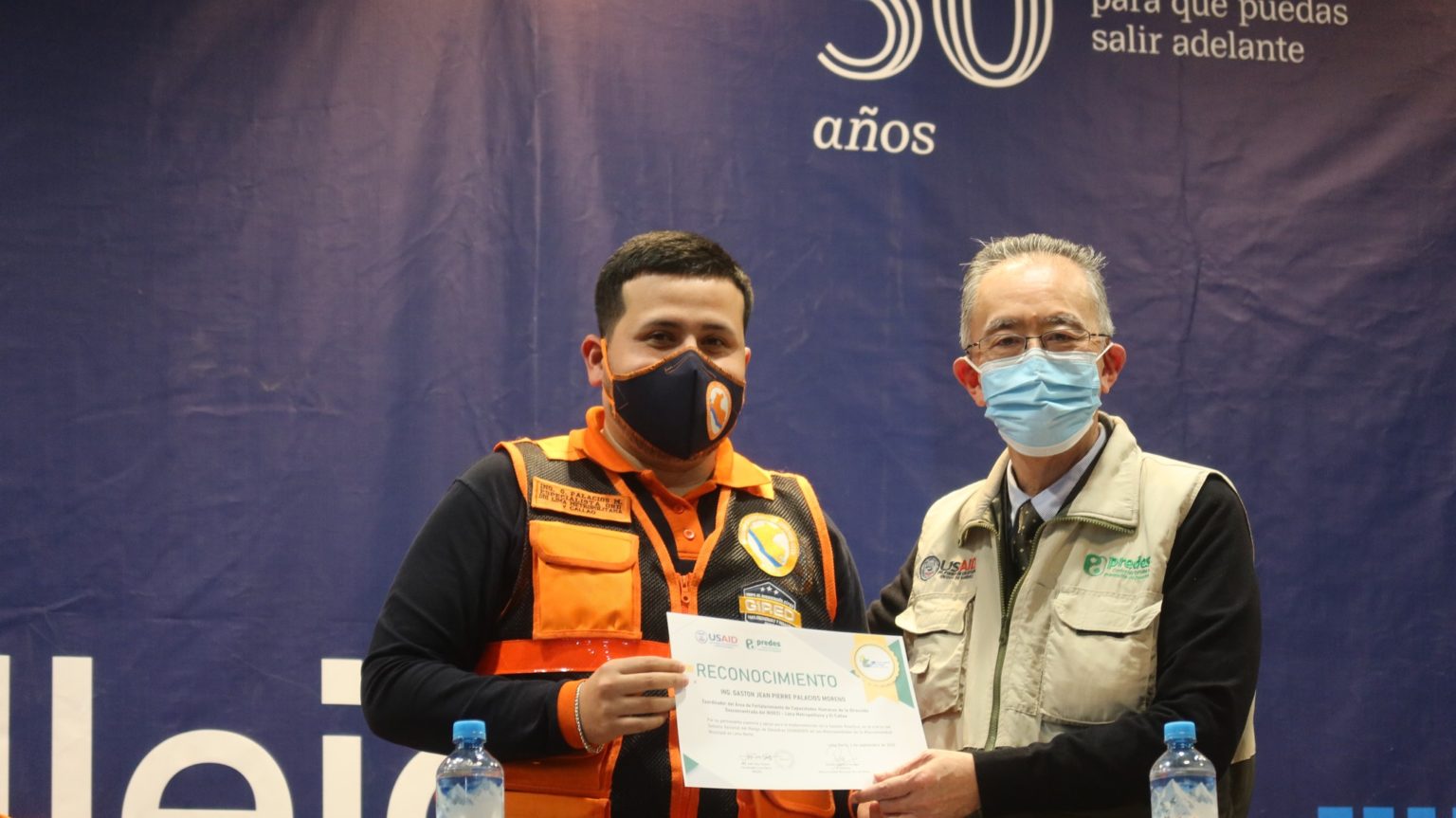 Además, se brindó un reconocimiento a la Dirección Desconcentrada del INDECI – Lima Metropolitana y Callao, en la persona de su director, CRL. EP (R) Pedro Luis Pascual Diaz, y al Ing. Gastón Palacios, coordinador del Área de Fortalecimiento de Capacidades Humanas, por su permanente asesoría y apoyo para la implementación de la Gestión Reactiva, en el marco del Sistema Nacional de Gestión del Riesgo de Desastres (SINAGERD) en las Municipalidades de la Mancomunidad Municipal de Lima Norte.